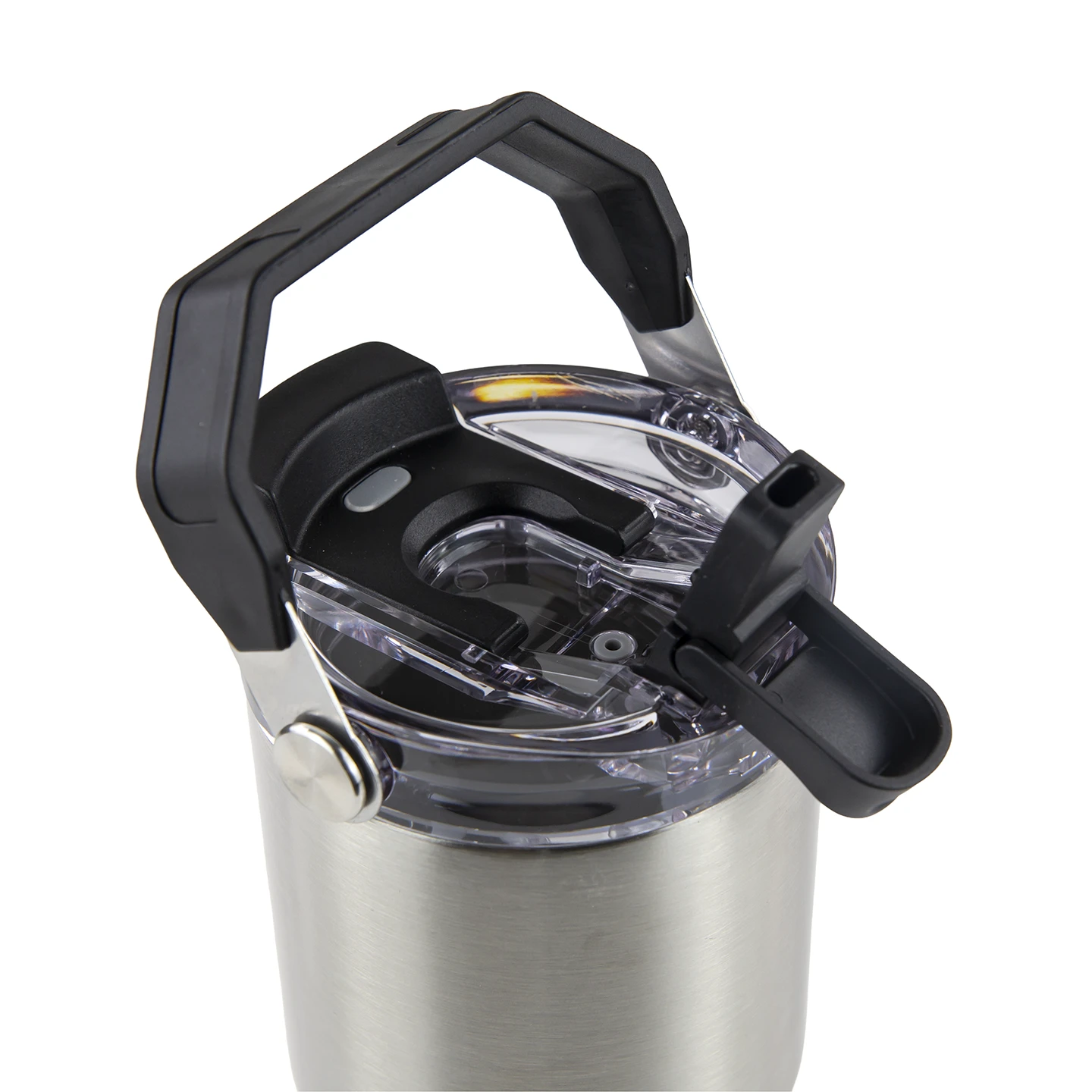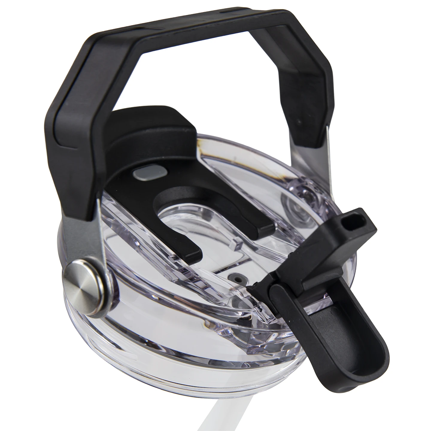 - Clear screw-on lid with black handle and accents